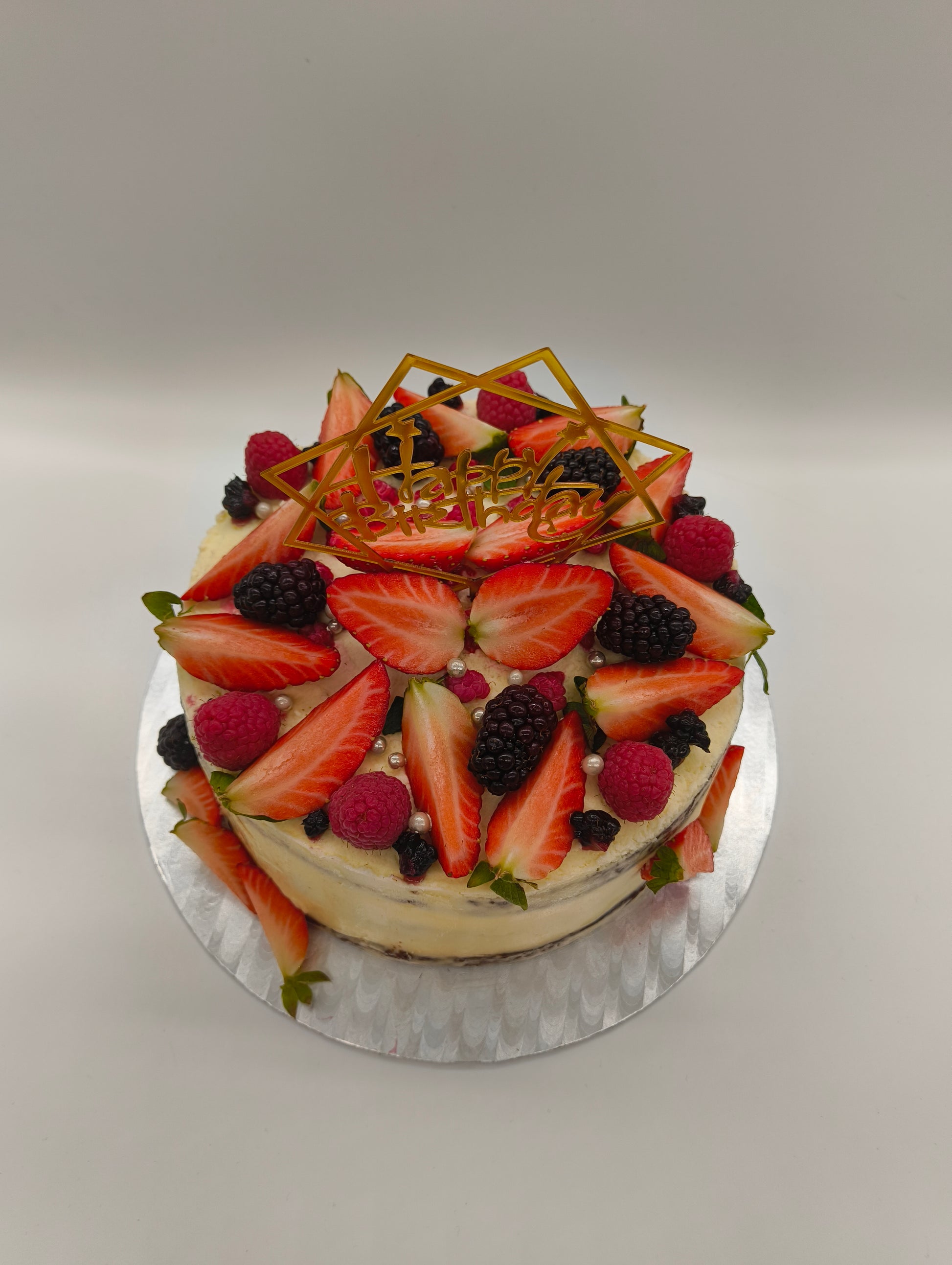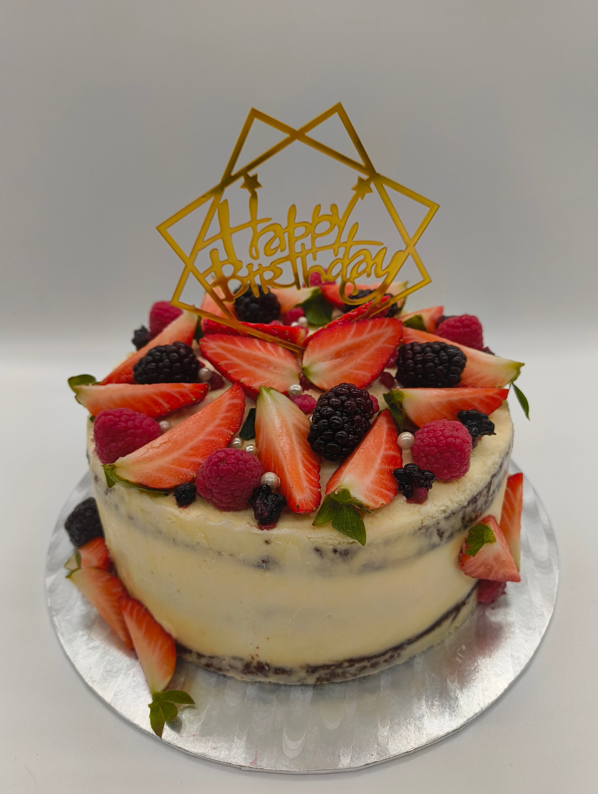 ¡Celebra con estilo! Nuestra exquisita tarta Red Velvet está cubierta con un suave y cremoso frosting de queso crema, decorada con fresas frescas, moras y frambuesas. Su diseño semi naked le da un toque rústico y moderno, ideal para cumpleaños u ocasiones especiales.